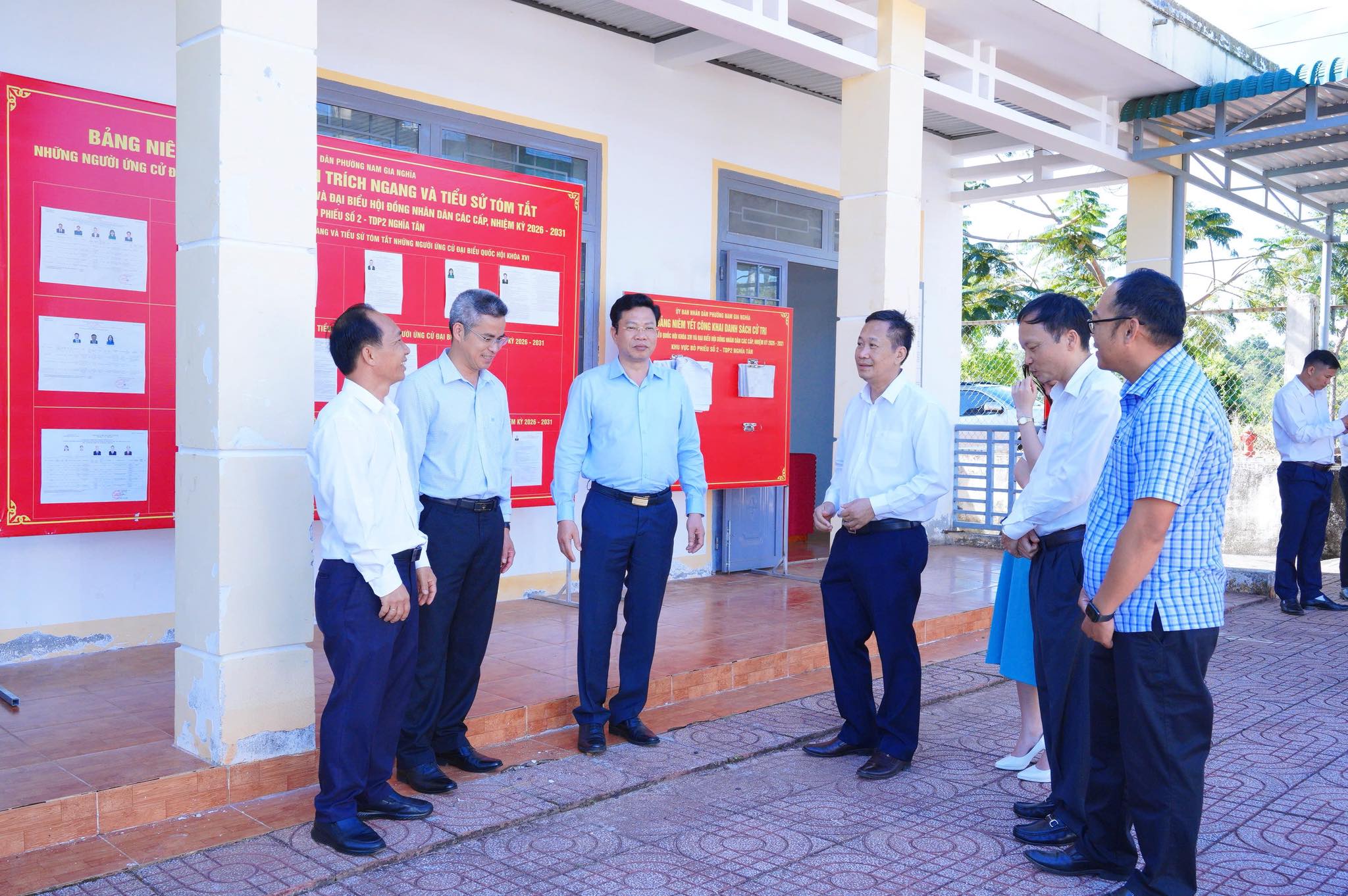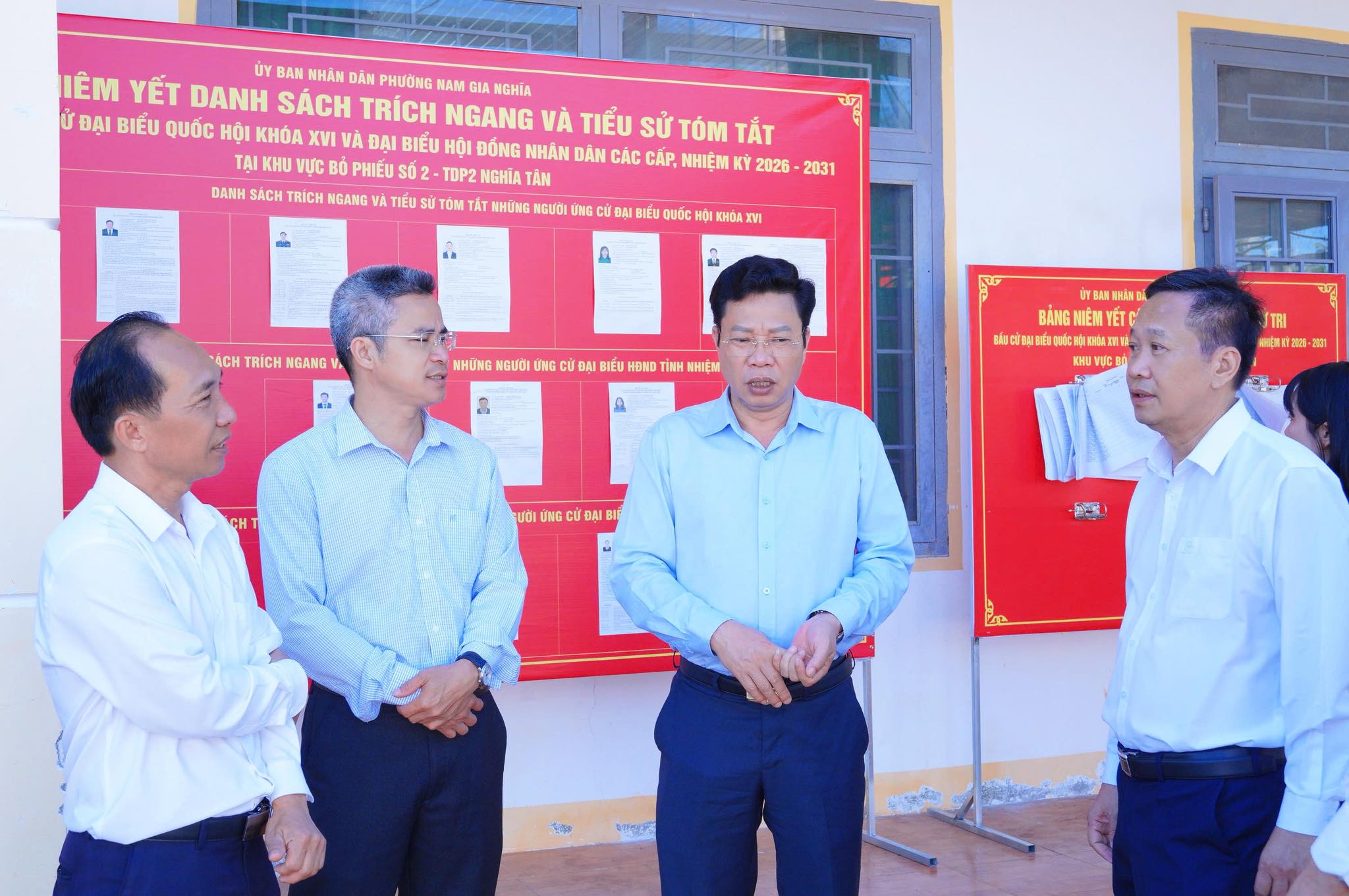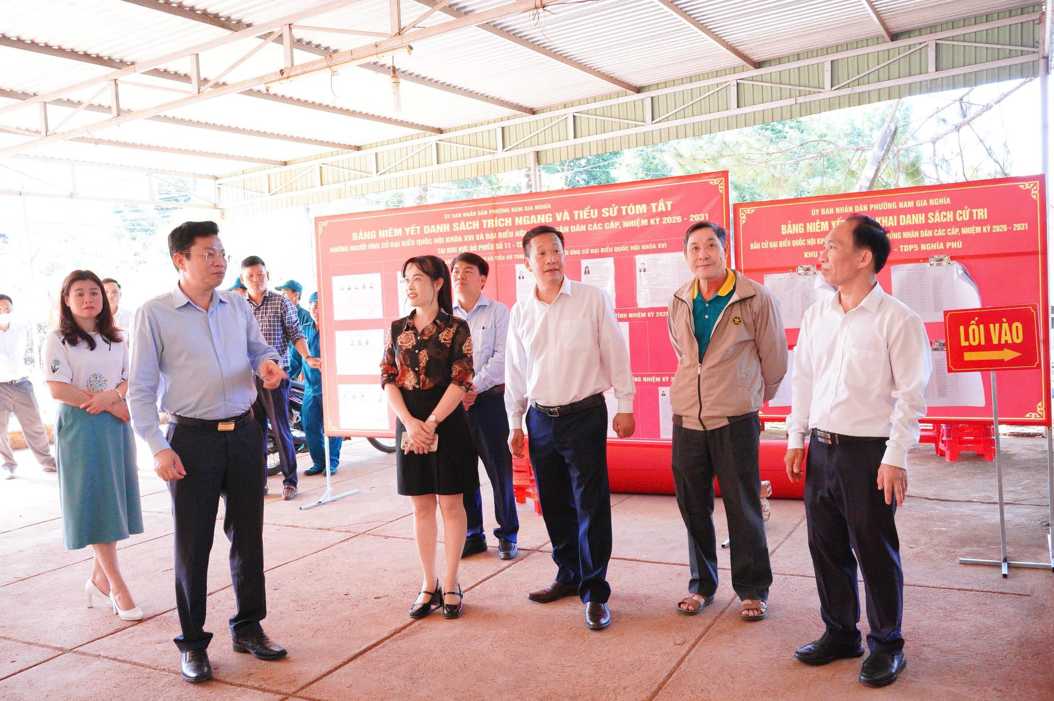 Đoàn đã kiểm tra thực tế tại điểm bỏ phiếu của cử tri Tổ dân phố 2 Nghĩa Tân và Tổ dân phố 5 Nghĩa Phú, phường Nam Gia Nghĩa. Tại các điểm bỏ phiếu, đại diện các tổ bầu cử đã báo cáo nhanh với đoàn về tình hình chuẩn bị cho ngày bầu cử, trong đó tập trung vào các nội dung như: niêm yết danh sách cử tri, danh sách người ứng cử; bố trí khu vực bỏ phiếu; chuẩn bị thùng phiếu, tài liệu hướng dẫn và các điều kiện phục vụ cử tri trong ngày bầu cử.