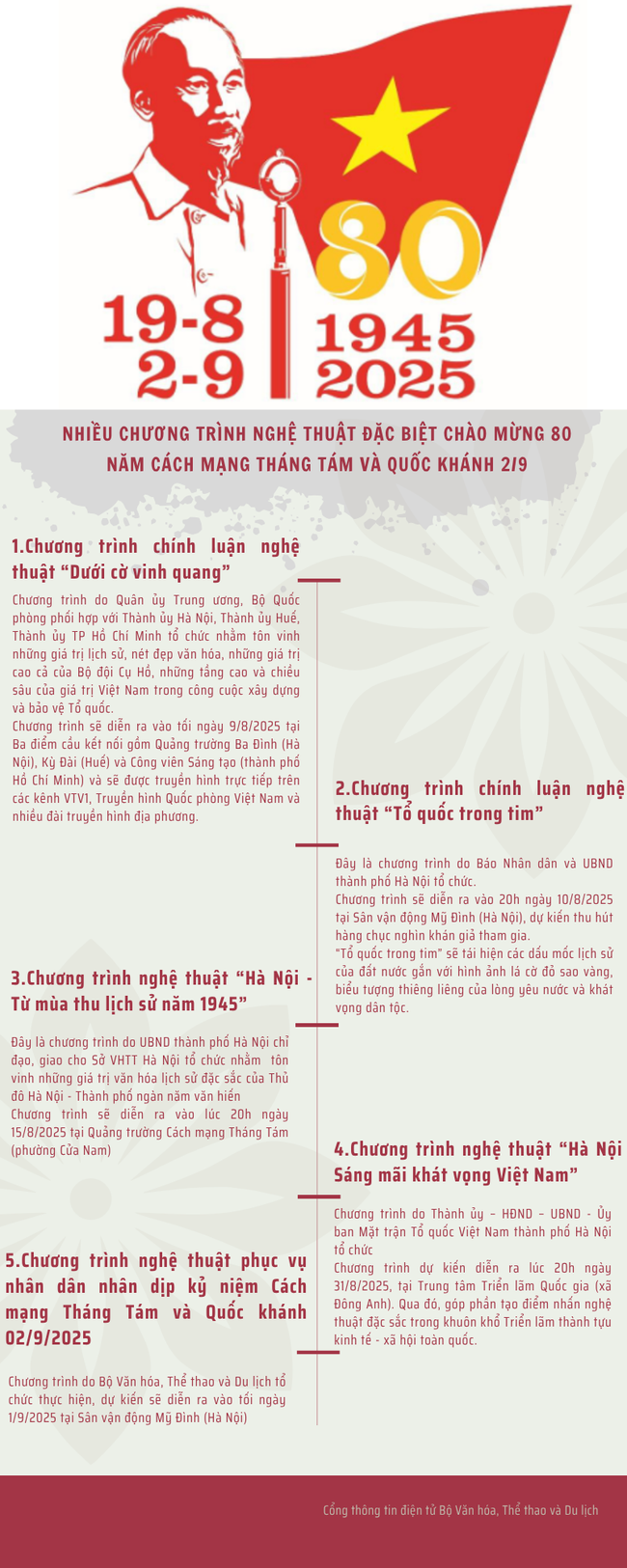 Bộ Văn hóa, Thể thao và Du lịch đã ban hành Kế hoạch số 3950/KH-BVHTTDL về việc tổ chức thực hiện “Chương trình nghệ thuật đặc biệt” và nhiệm vụ “Diễu hành, xếp hình nghệ thuật tại Lễ diễu binh, diễu hành” Kỷ niệm 80 năm Cách mạng tháng Tám thành công (19/8/1945 – 19/8/2025) và Quốc khánh nước Cộng hòa xã hội chủ nghĩa Việt Nam (02/9/1945 – 02/9/2025)”.