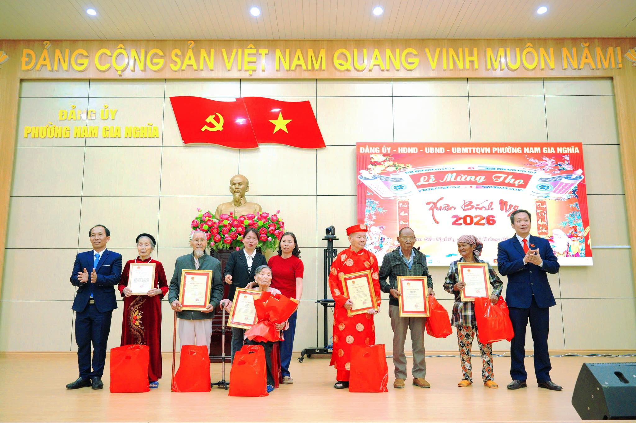 Sáng 26/2, UBND phường Nam Gia Nghĩa long trọng tổ chức Lễ mừng thọ, chúc thọ người cao tuổi năm 2026. Tham dự buổi lễ có đồng chí Ngô Đức Trọng – Bí thư Đảng ủy, Chủ tịch HĐND phường; đồng chí Phan Văn Quốc – Phó Bí thư Đảng ủy, Chủ tịch UBND phường; cùng lãnh đạo Đảng ủy, HĐND, UBND, Ủy ban MTTQ Việt Nam phường, các ban, ngành, đoàn thể và 112 cụ cao tuổi trên địa bàn.